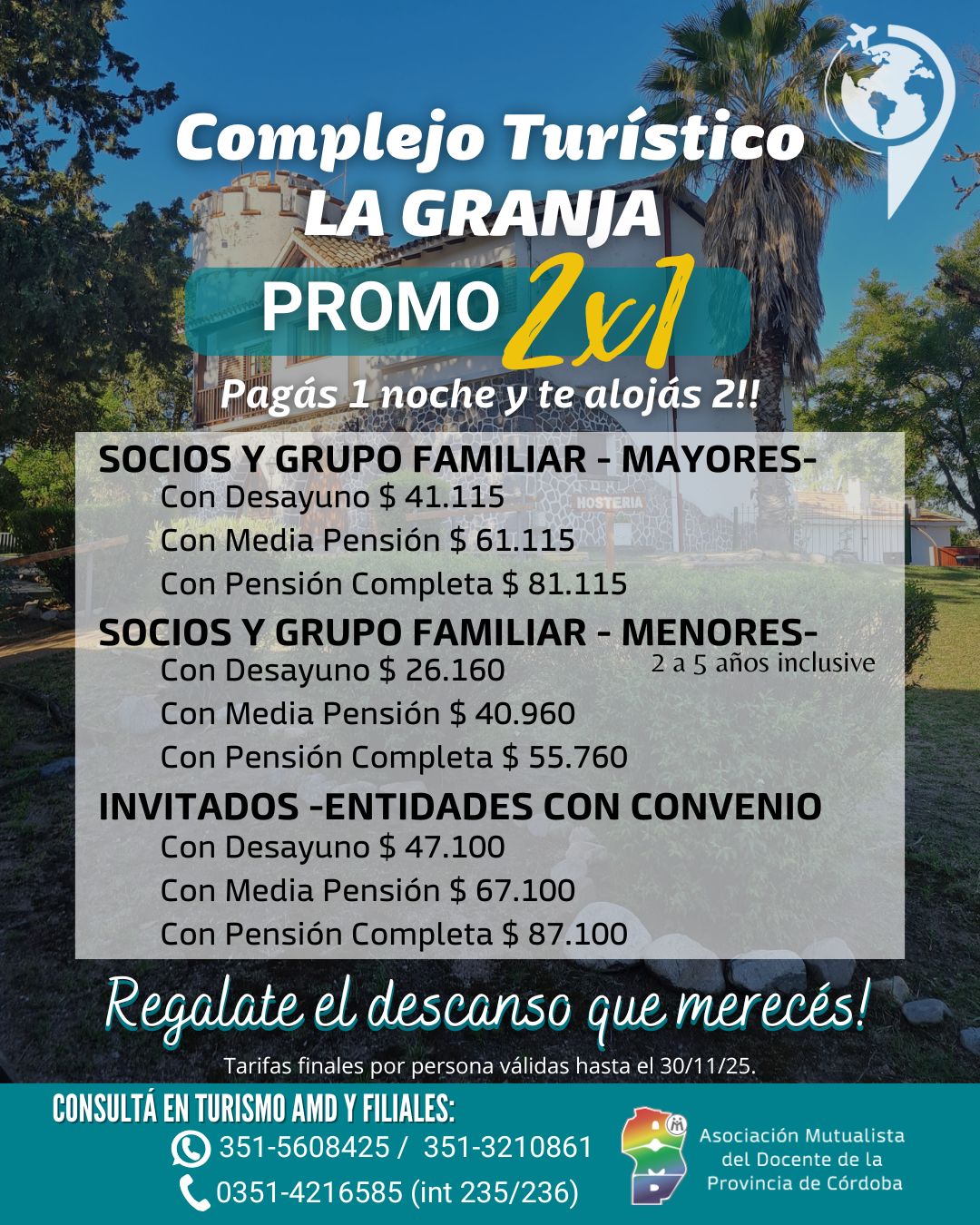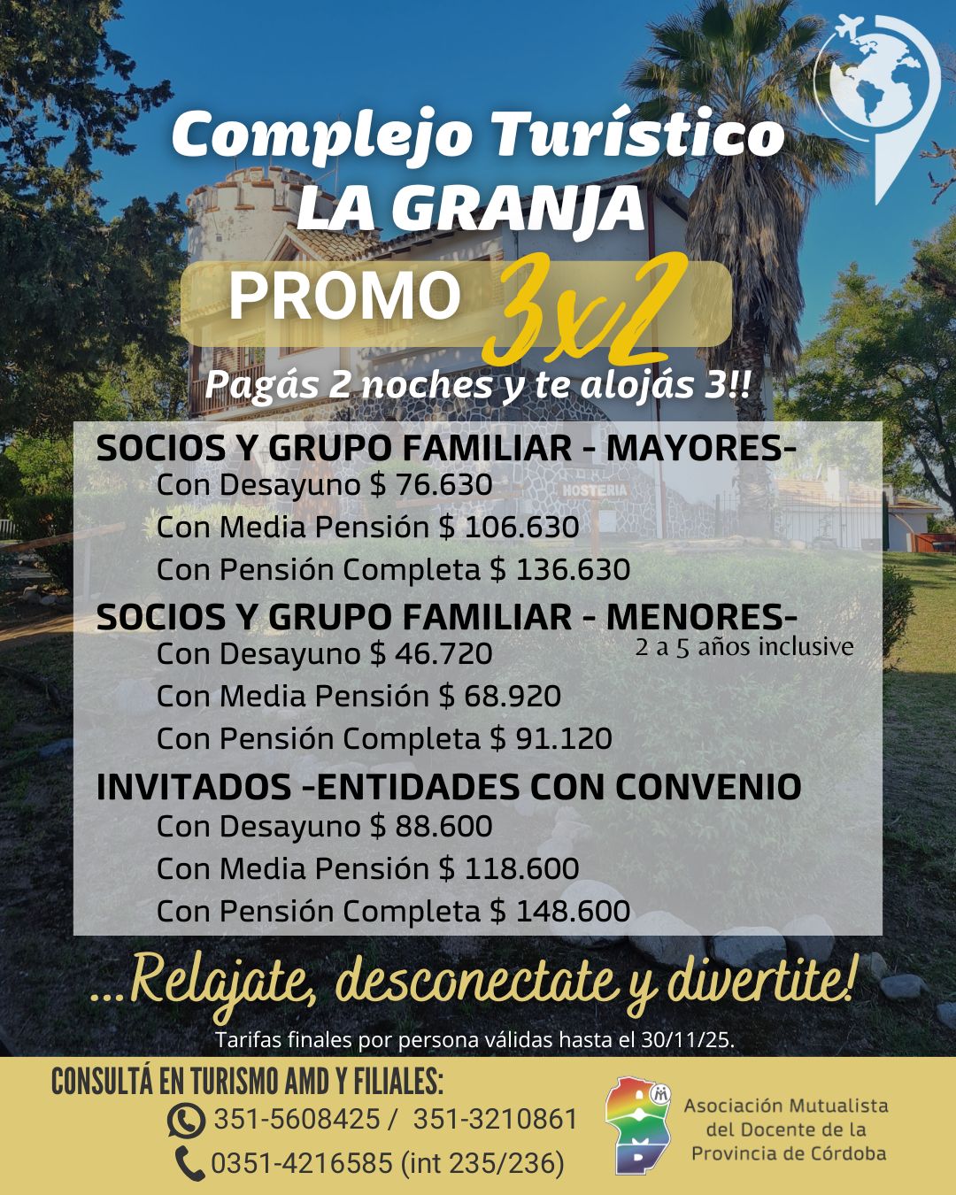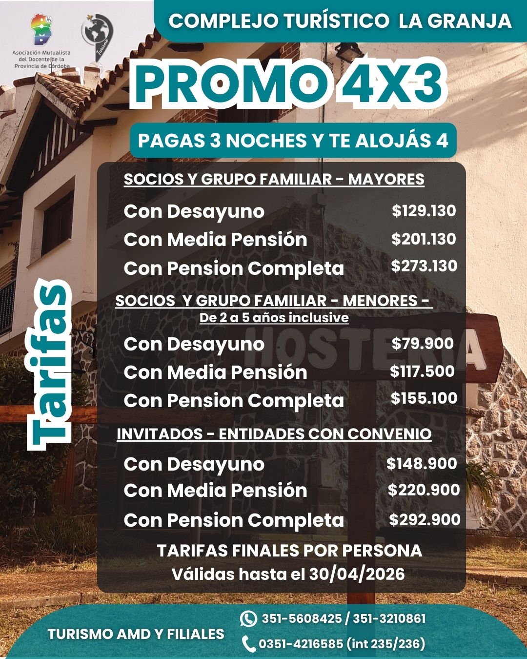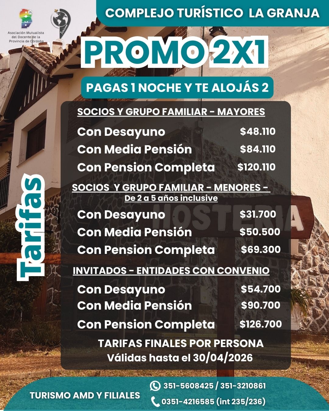 El Complejo Turístico de la Asociación Mutualista del Docente de la Provincia de Córdoba se ubica en la localidad de La Granja a 56 kilómetros de la ciudad de Córdoba.